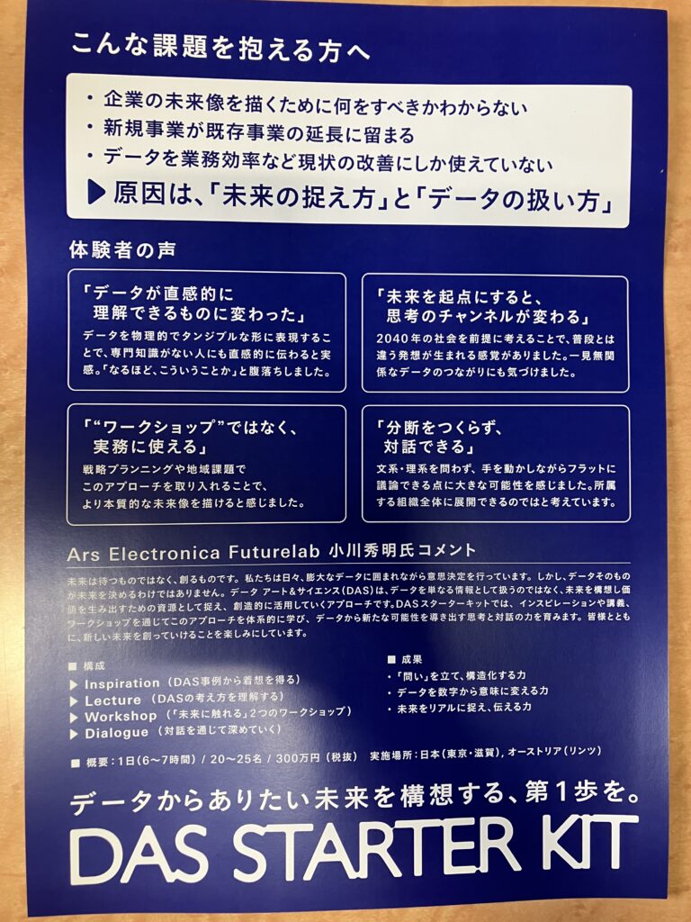 そこで、この会社は、この事業はこのままでいいのだろうか、そんな疑問を持たれている、会社の社長、幹部、または若手社員の方々にお勧めしたいのが、DASアプローチを比較的手軽に体験できるワークショップ、「DAS STARTER KIT」です。